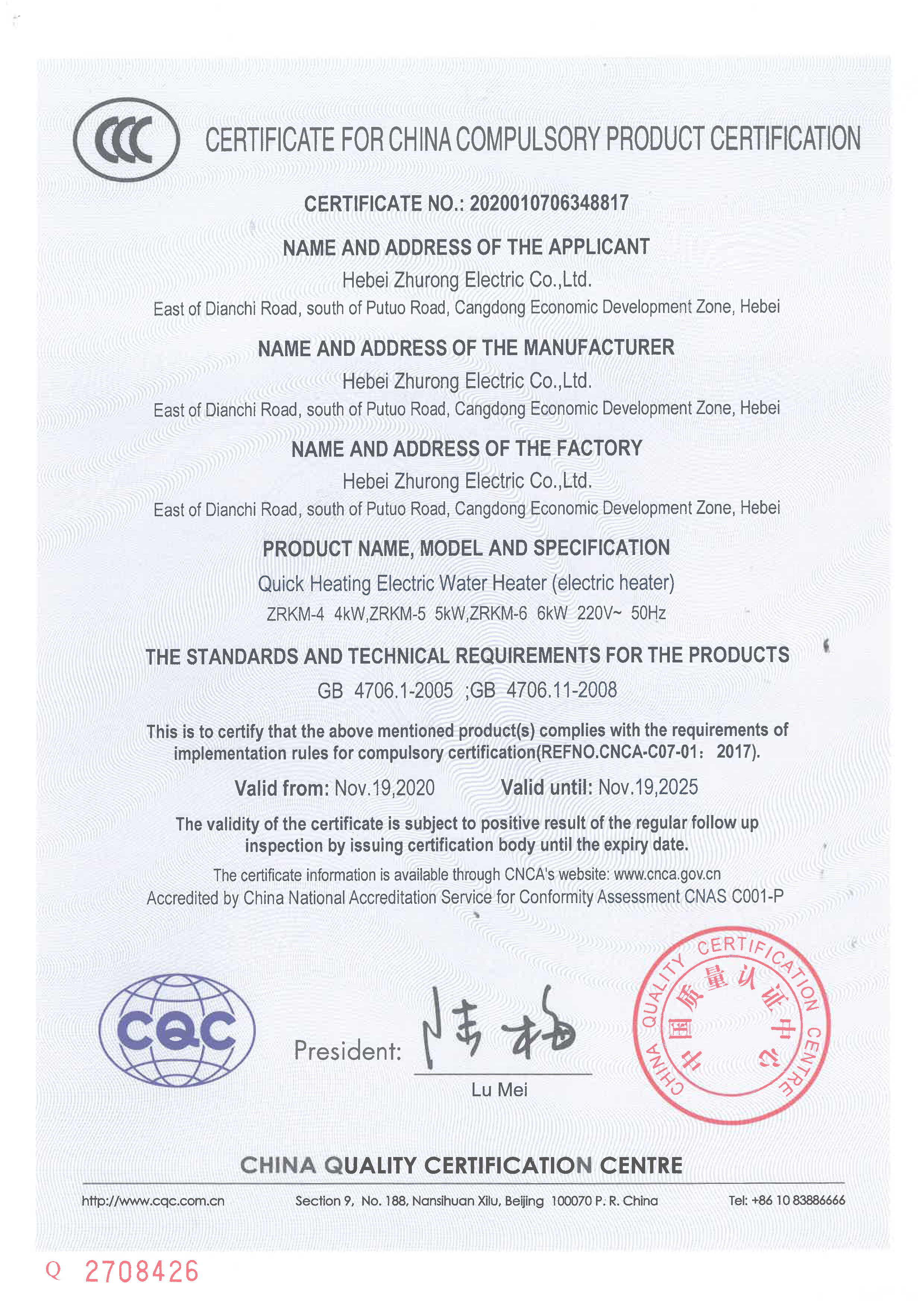 电采暖炉4-6KW3C认证书英文版